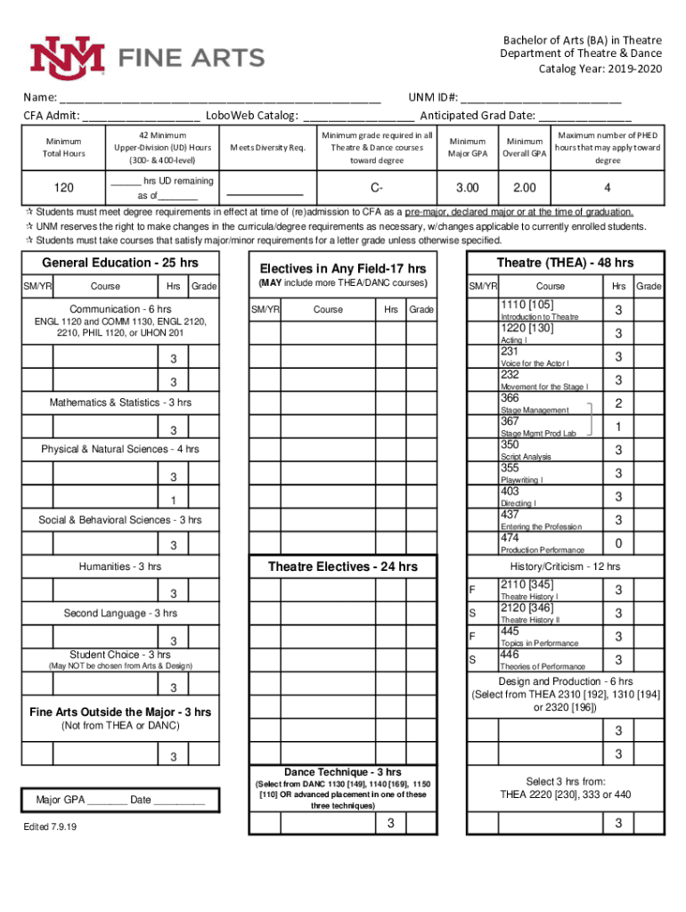 Bachelor of Arts (BA) in Theater Department of Theater & Dance Catalog Year: 20192020 Name: ___ UNM ID#: ___ CFA Admit: ___ Cobweb Catalog: ___ Anticipated Grad Date: ___ Minimum Total Hours12042