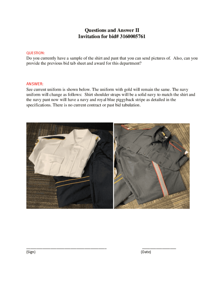 Questions and Answer II Invitation for bid# 3160005761 QUESTION:Do you currently have a sample of the shirt and pant that you can send pictures of. Also, can you provide the previous bid tab sheet