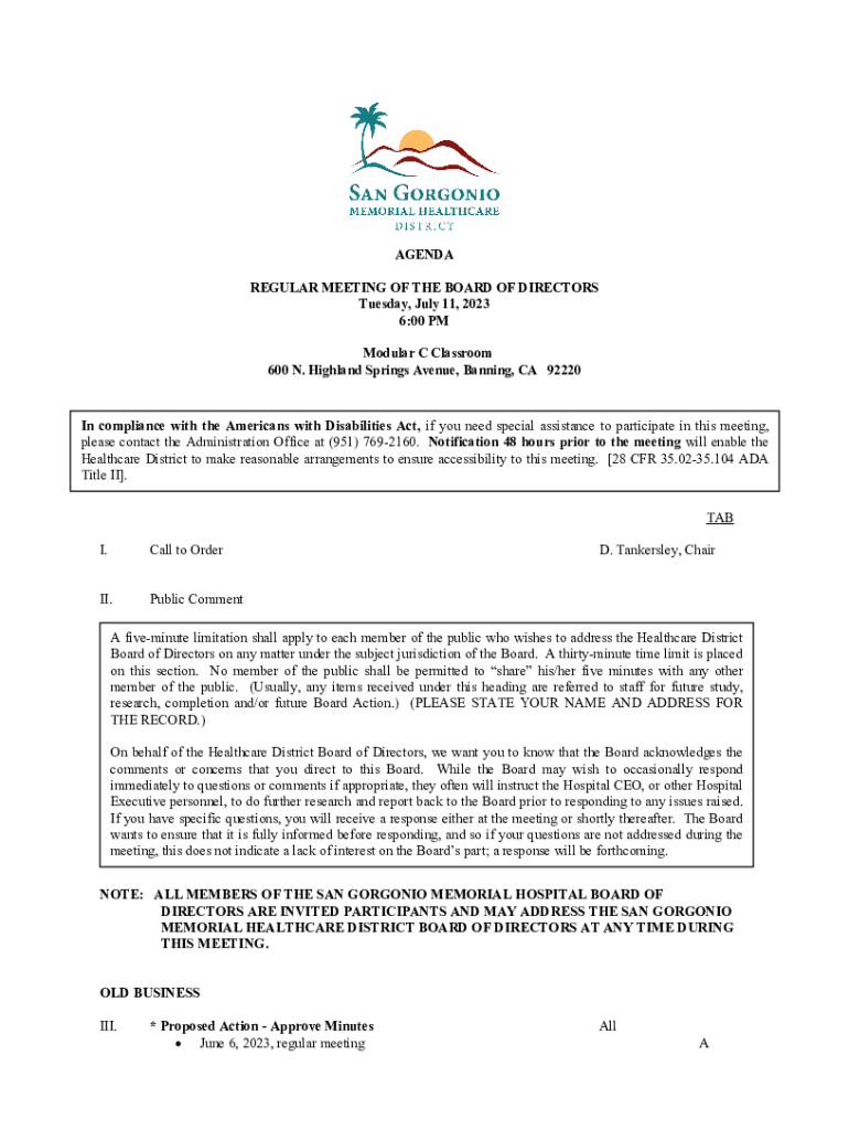 AGENDA REGULAR MEETING OF THE BOARD OF DIRECTORS Tuesday, July 11, 2023 6:00 PM Modular C Classroom 600 N. Highland Springs Avenue, Banning, CA 92220In compliance with the Americans with Disabilities