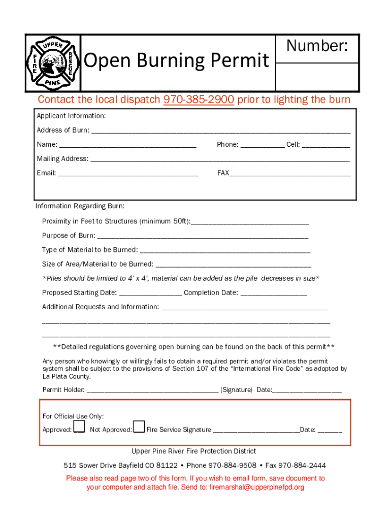 Page TitleOpen Burning PermitNumber:Contact the local dispatch 9703852900 prior to lighting the burn. Applicant Information: Address of Burn: ___ Name: ___Phone: ___ Cell: ___Mailing Address: ___