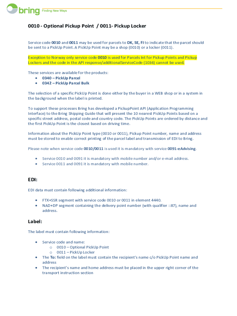 0010 Optional Pickup Point / 0011 Pickup Locker Service code 0010 and 0011 may be used for parcels to DK, SE, FI to indicate that the parcel should be sent to a Pickup Point. A Pickup Point may be