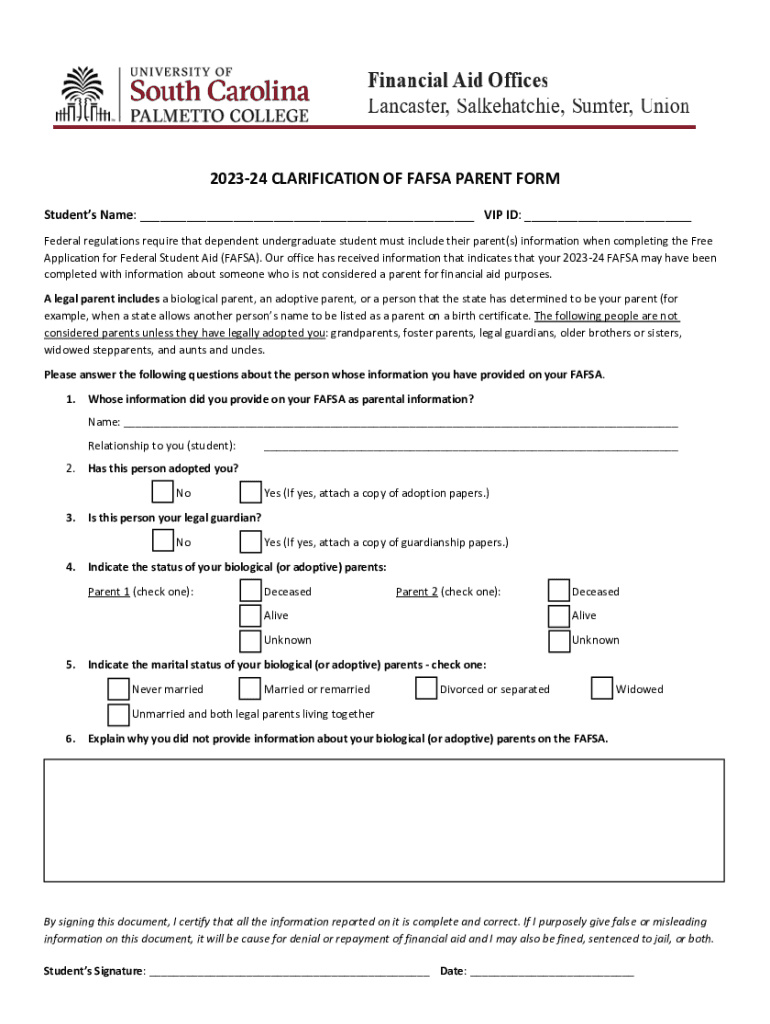 Get the free 2023-24 CLARIFICATION OF FAFSA PARENT FORM - cpc sc