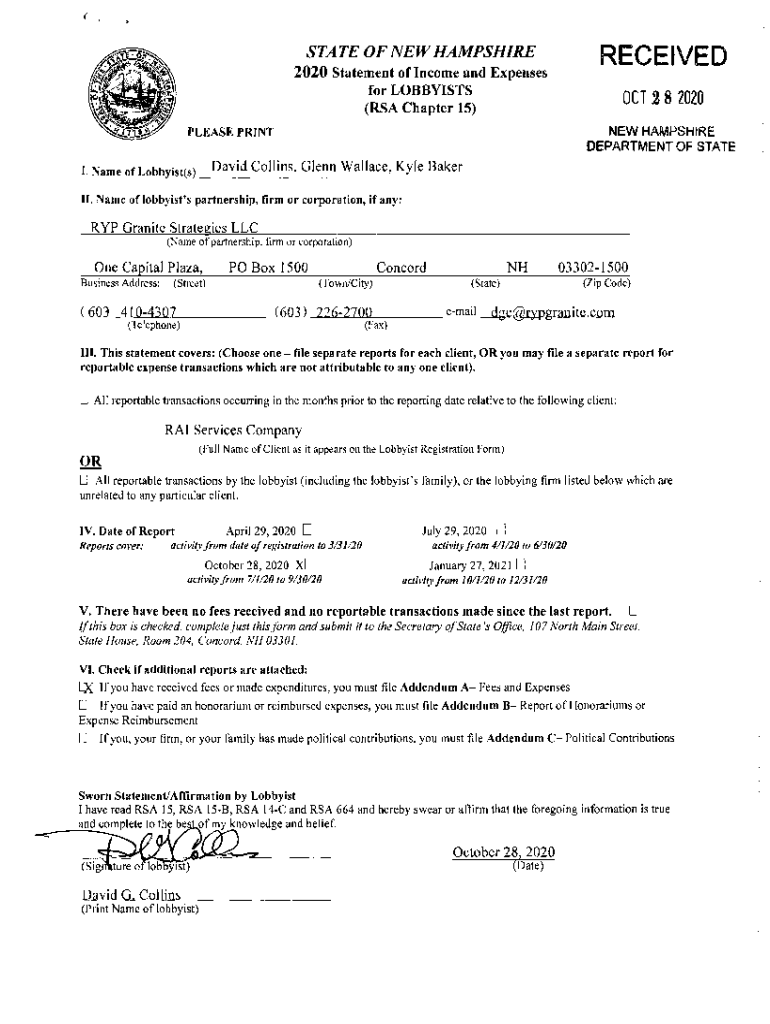 STATE OF NEW HAMPSHIRE 2020 Statement of Income and ExpensesRECEIVEDfor LOBBYISTS (RSA Chapter 15)OCT 2 8 2020 NEW HAMPSHIRE DEPARTMENT OF STATELESS PRINT David Collins, Glenn Wallace, Kyle Baker1.