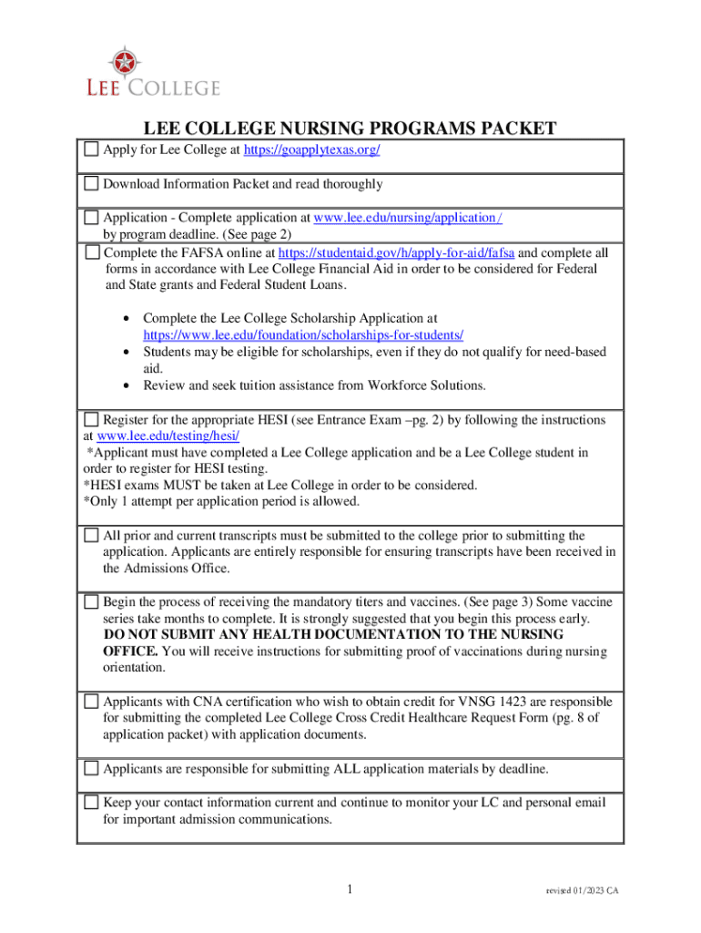 LEE COLLEGE NURSING PROGRAMS PACKET Apply for Lee College at https://goapplytexas.org/ Download Information Packet and read thoroughly Application Complete application at www.lee.edu/nursing/application/
