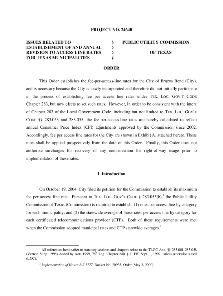 PROJECT NO. 24640 ISSUES RELATED TO ESTABLISHMENT OF AND ANNUAL REVISION TO ACCESS LINE RATES FOR TEXAS MUNICIPALITIES PUBLIC UTILITY COMMISSION OF TEXASORDER This Order establishes the feeperaccessline