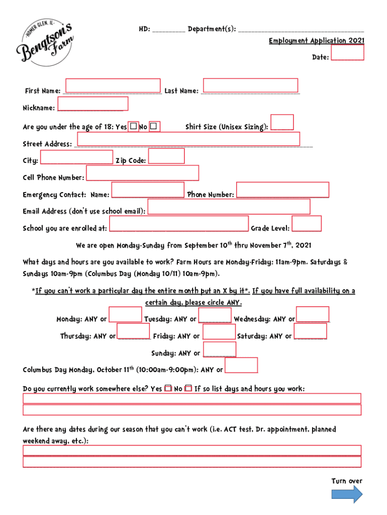 HD: ___ Department(s): ___ Employment Application 2021 Date: ___First Name: ___ Last Name: ___ Nickname: ___ Are you under the age of 18: Yes No Shirt Size (Unisex Sizing): ___Street Address: ___