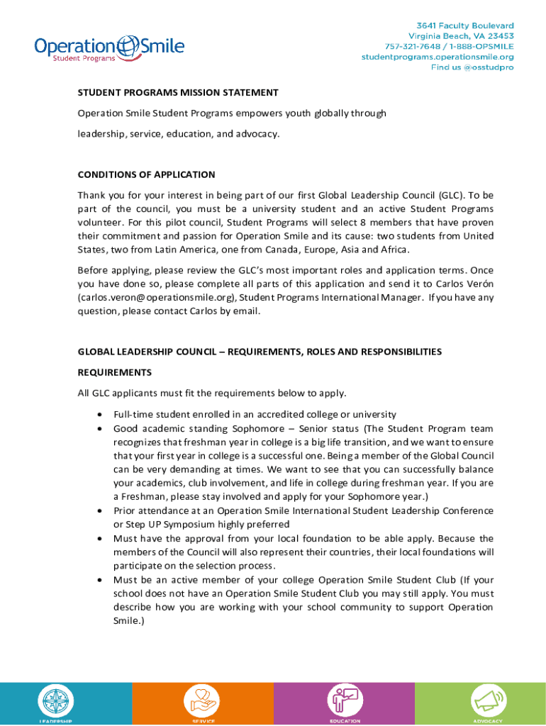 STUDENT PROGRAMS MISSION STATEMENT Operation Smile Student Programs empowers youth globally through leadership, service, education, and advocacy. CONDITIONS OF APPLICATION Thank you for your interest