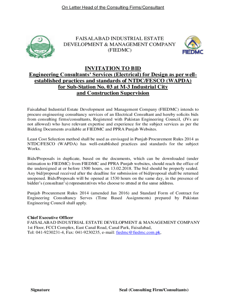 On Letter Head of the Consulting Firms/ConsultantFAISALABAD INDUSTRIAL ESTATE DEVELOPMENT & MANAGEMENT COMPANY (FIE DMC)INVITATION TO BID Engineering Consultants Services (Electrical) for Design as