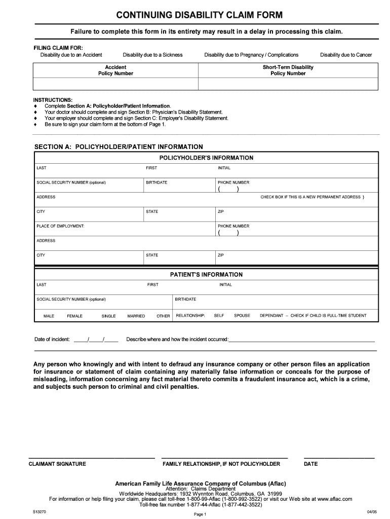 CONTINUING DISABILITY CLAIM FORM Failure to complete this form in its entirety may result in a delay in processing this claim. FILING CLAIM FOR: Disability due to an Accident Disability due to a Sickness