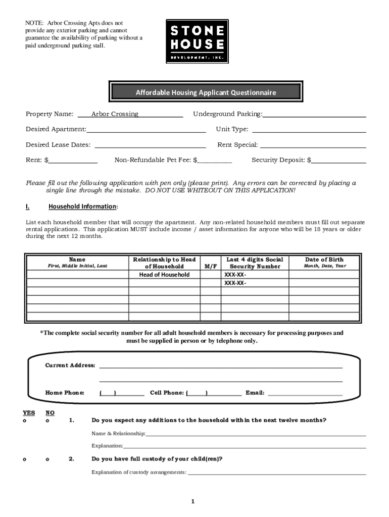NOTE: Arbor Crossing Acts does not provide any exterior parking and cannot guarantee the availability of parking without a paid underground parking stall. Affordable Housing Applicant Questionnaire
