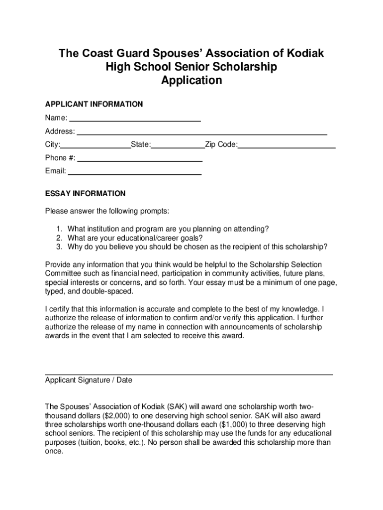 The Coast Guard Spouses Association of Kodiak High School Senior Scholarship Application APPLICANT INFORMATION Name: Address: City:State:Zip Code:Phone #: Email: ESSAY INFORMATION Please answer the