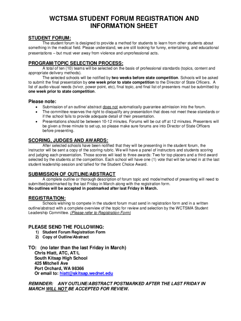 WC TSMA STUDENT FORUM REGISTRATION AND INFORMATION SHEET STUDENT FORUM: The student forum is designed to provide a method for students to learn from other students about something in the medical field.
