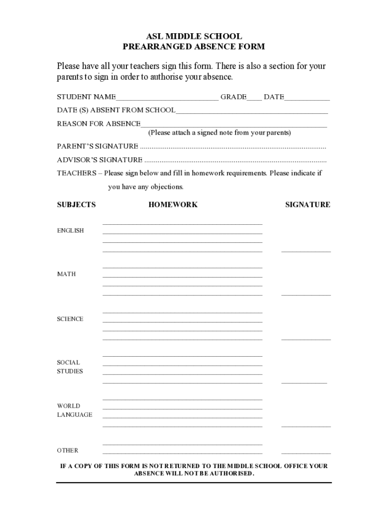 ASL MIDDLE SCHOOL PREARRANGED ABSENCE FORM Please have all your teachers sign this form. There is also a section for your parents to sign in order to authorize your absence. STUDENT NAME___ GRADE___