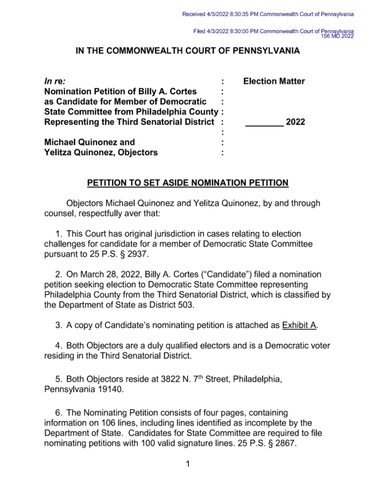 Received 4/3/2022 8:30:35PMCommonwealth Court of PennsylvaniaFiled 4/3/2022 8:30:00PMCommonwealth Court of Pennsylvania 156 MD 2022IN THE COMMONWEALTH COURT OF Pennsylvanian re: Nomination Petition