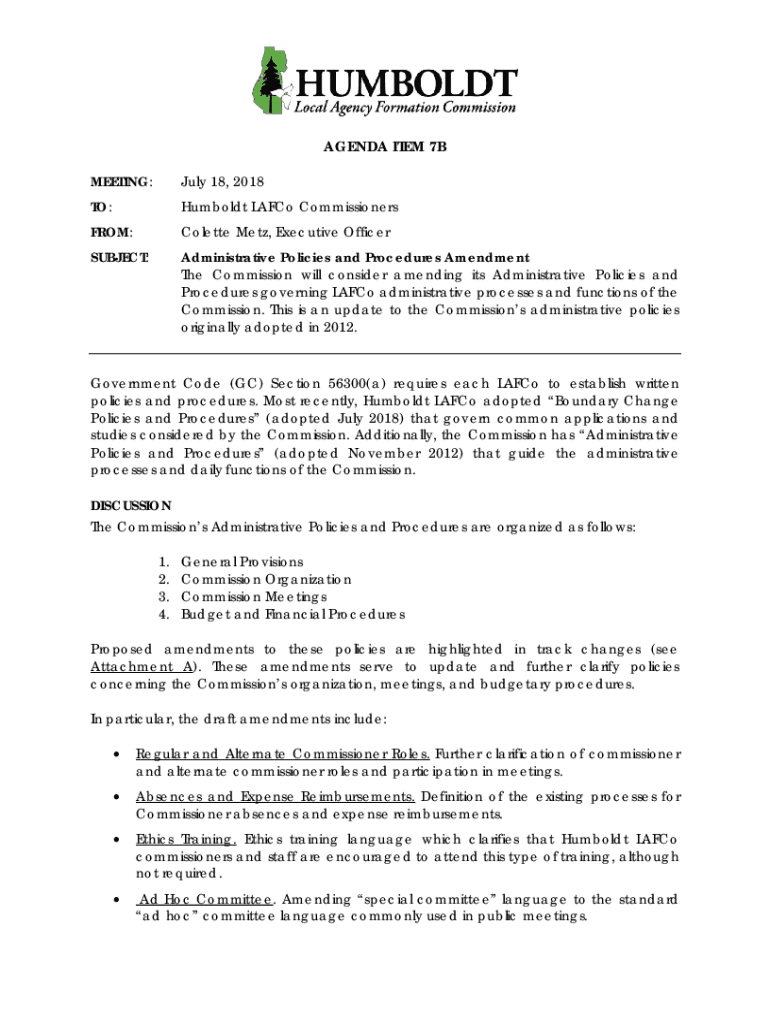 AGENDA ITEM 7B MEETING:July 18, 2018TO:Humboldt DAFCO CommissionersFROM:Colette Metz, Executive OfficerSUBJECT:Administrative Policies and Procedures Amendment The Commission will consider amending