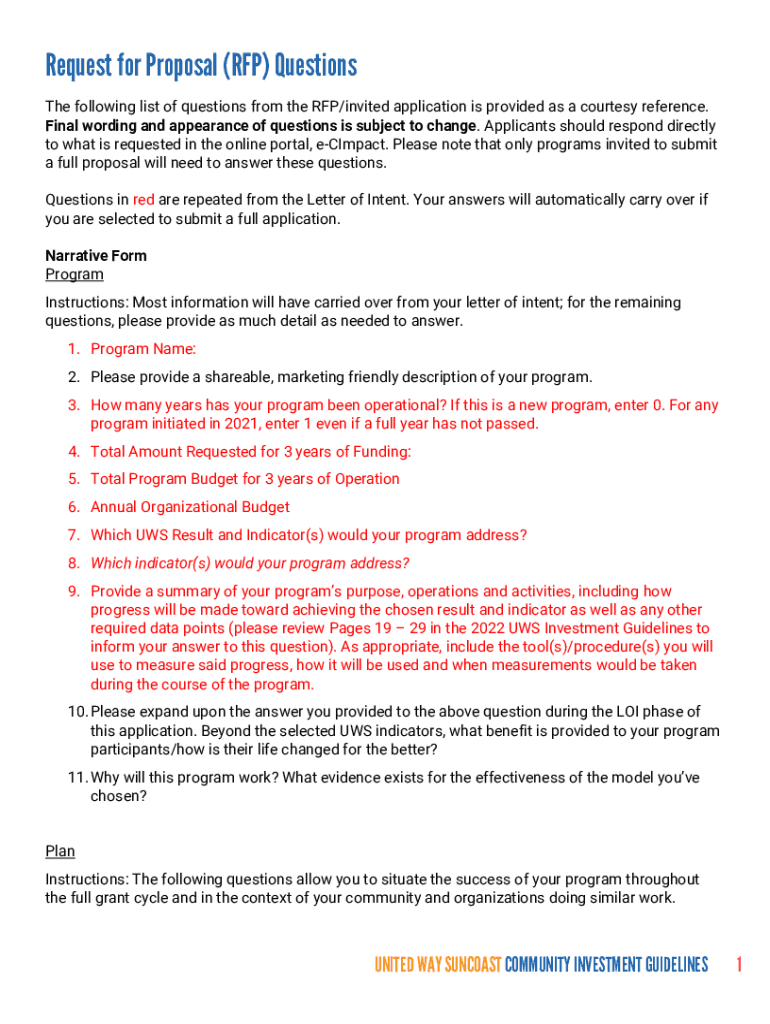 Request for Proposal (RFP) Questions The following list of questions from the RFP/invited application is provided as a courtesy reference. Final wording and appearance of questions is subject to change.