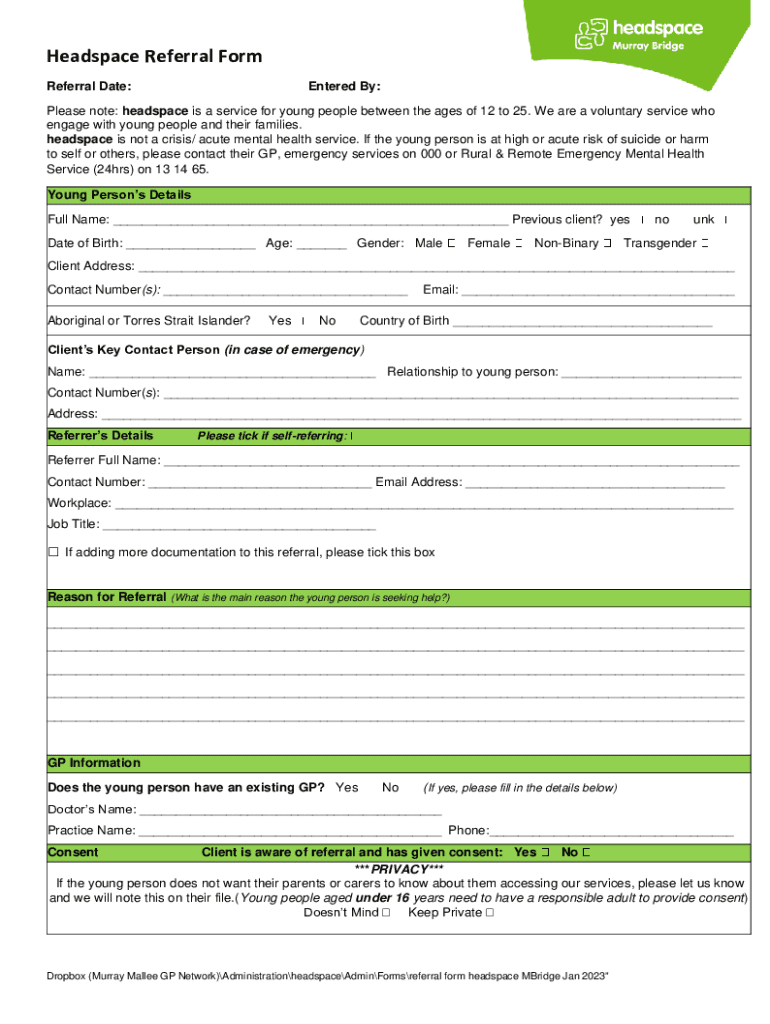 Headspace Referral Form Referral Date:Entered By:Please note: headspace is a service for young people between the ages of 12 to 25. We are a voluntary service who engage with young people and their