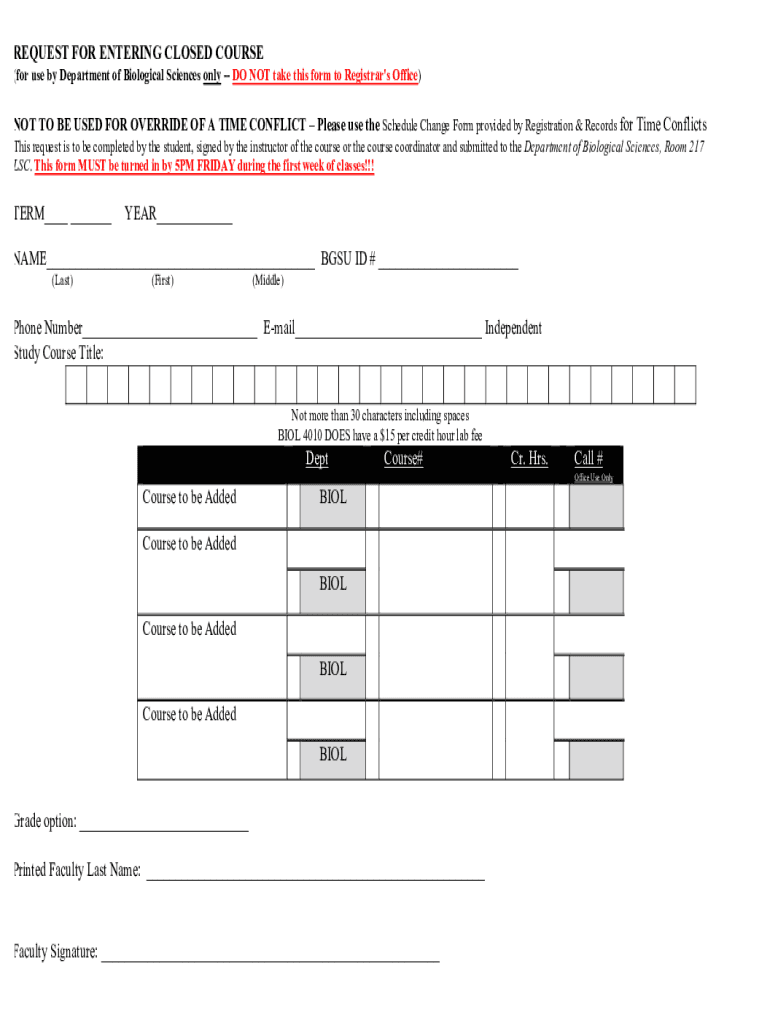 REQUEST FOR ENTERING CLOSED COURSE (for use by Department of Biological Sciences only DO NOT take this form to Registrar\'s Office)NOT TO BE USED FOR OVERRIDE OF A TIME CONFLICT Please use the Schedule
