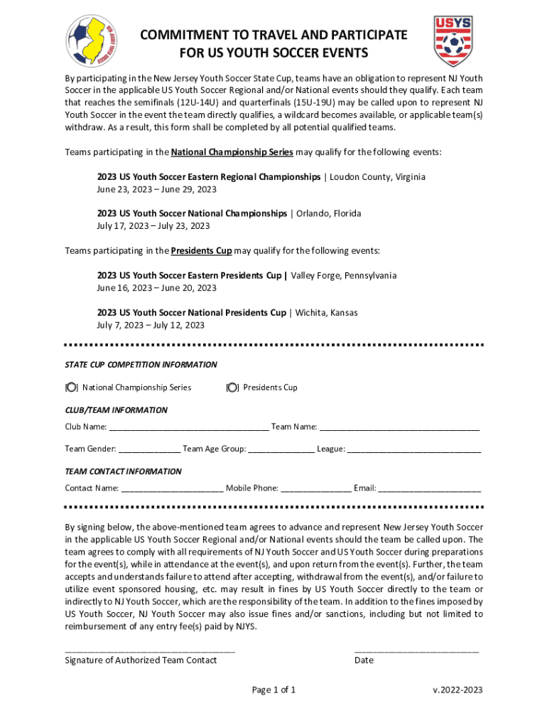 COMMITMENT TO TRAVEL AND PARTICIPATE FOR US YOUTH SOCCER EVENTS By participating in the New Jersey Youth Soccer State Cup, teams have an obligation to represent NJ Youth Soccer in the applicable US