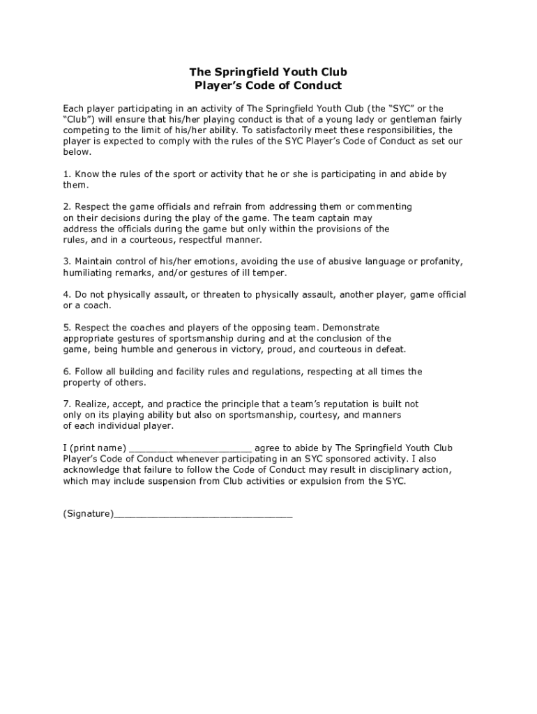 The Springfield Youth Club Players Code of Conduct Each player participating in an activity of The Springfield Youth Club (the SYC or the Club) will ensure that his/her playing conduct is that of
