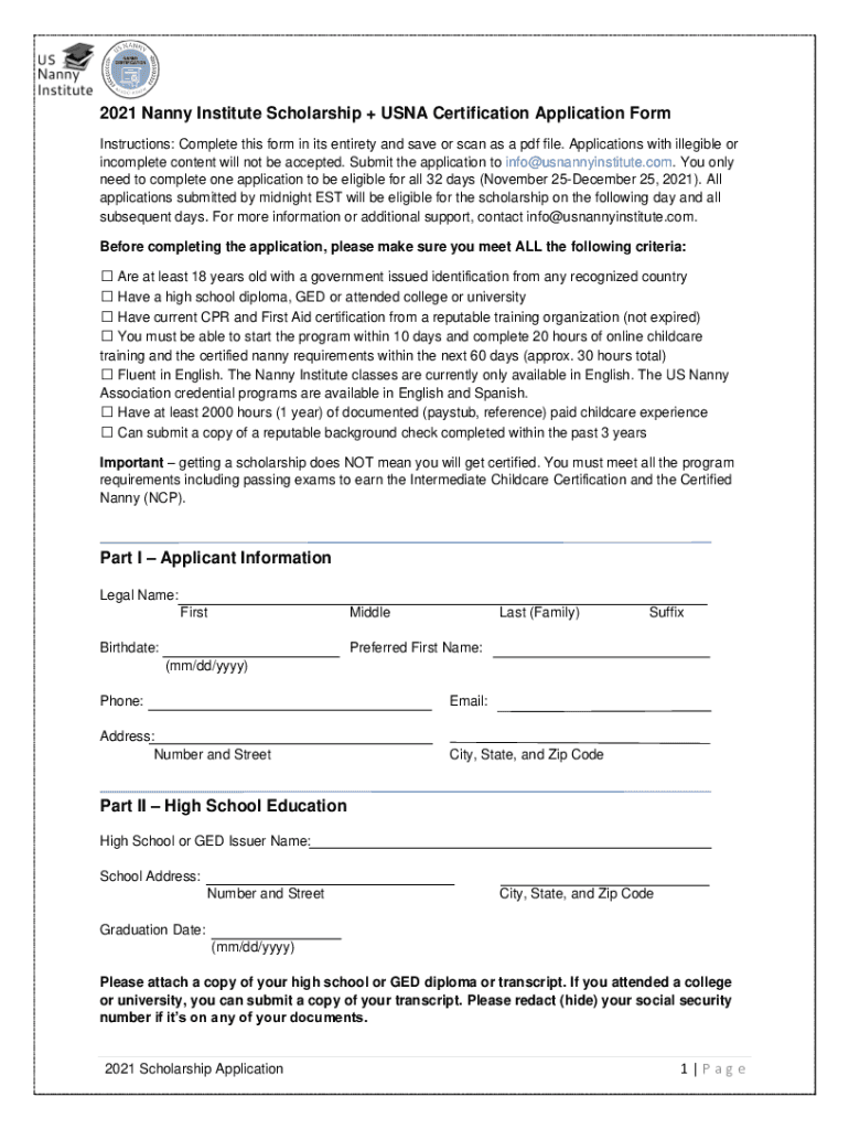 2021 Nanny Institute Scholarship + USA Certification Application Form Instructions: Complete this form in its entirety and save or scan as a PDF file. Applications with illegible or incomplete content
