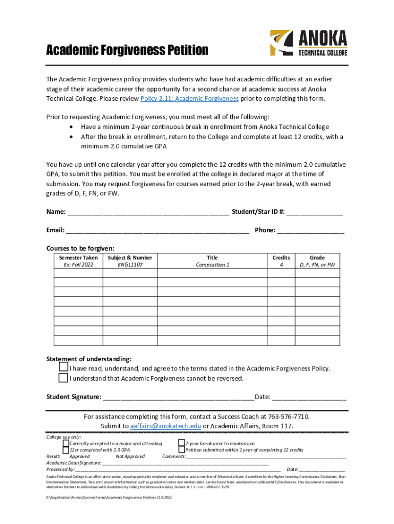 Academic Forgiveness Petition The Academic Forgiveness policy provides students who have had academic difficulties at an earlier stage of their academic career the opportunity for a second chance