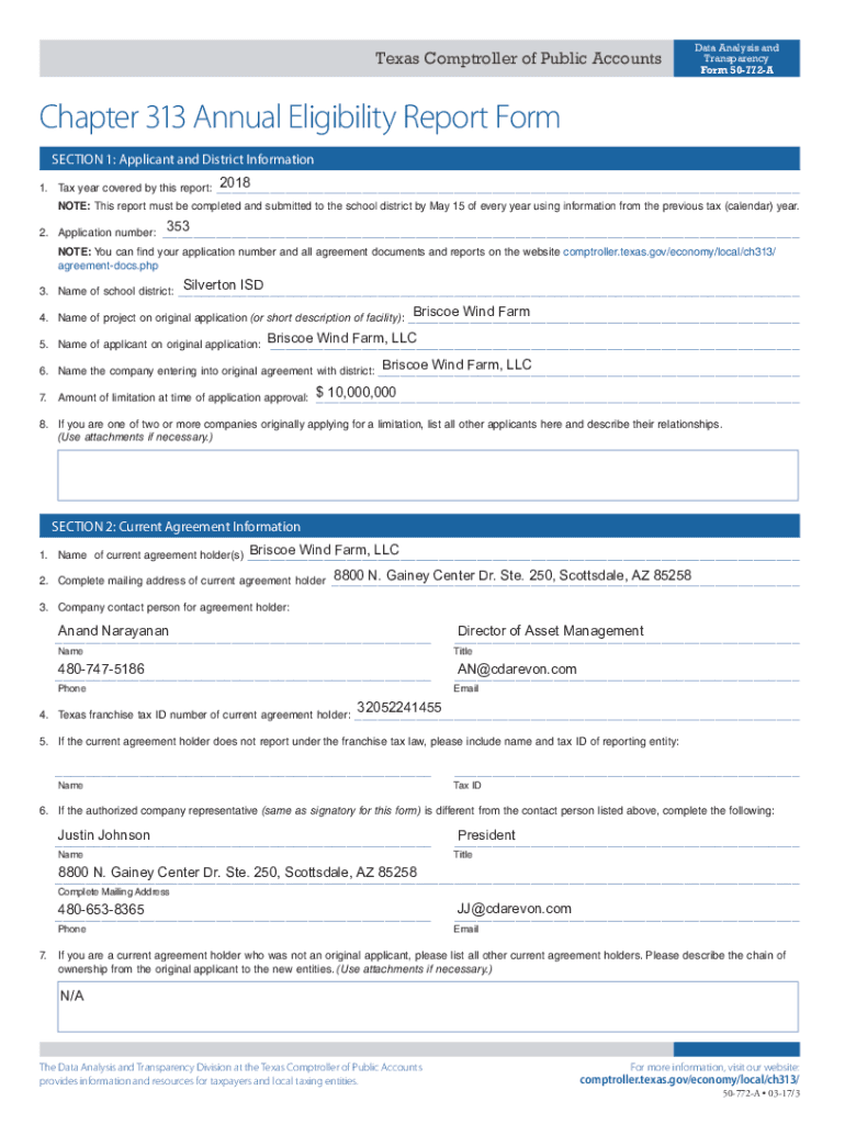 Texas Comptroller of Public AccountsData Analysis and Transparency Form 50772AChapter 313 Annual Eligibility Report Form SECTION 1: Applicant and District Information 1. Tax year covered by this report:2018