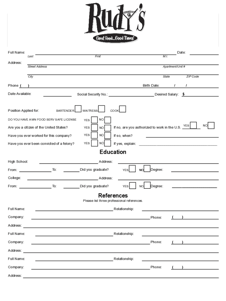 LastFirstM. I. Address:Phone (Street AddressApartment/Unit #Cityscape)Birth Date:Date Available:Position Applied for:ZIP Nonsocial Security No.:BARTENDERWAITRESS/Desired Salary:/
