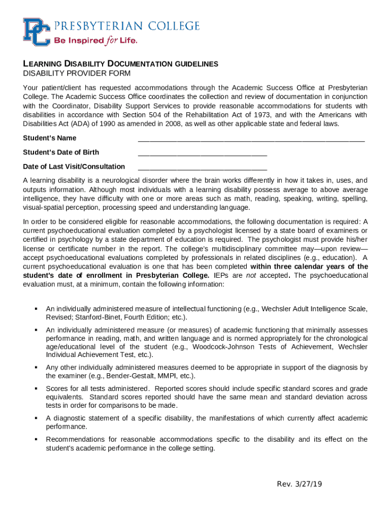 Instructions for the Disability ServicesPresbyterian CollegeClinton, SC form