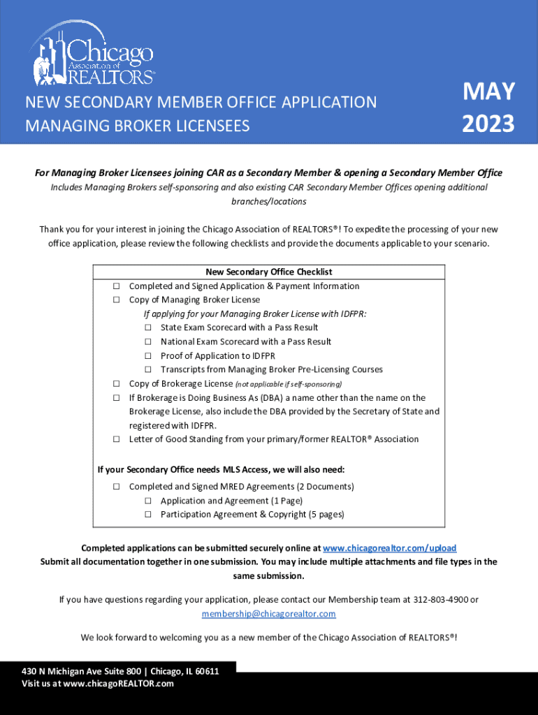 .NEW SECONDARY MEMBER OFFICE APPLICATION MANAGING BROKER LICENSEES 2023For Managing Broker Licensees joining CAR as a Secondary Member & opening a Secondary Member Office Includes Managing Brokers