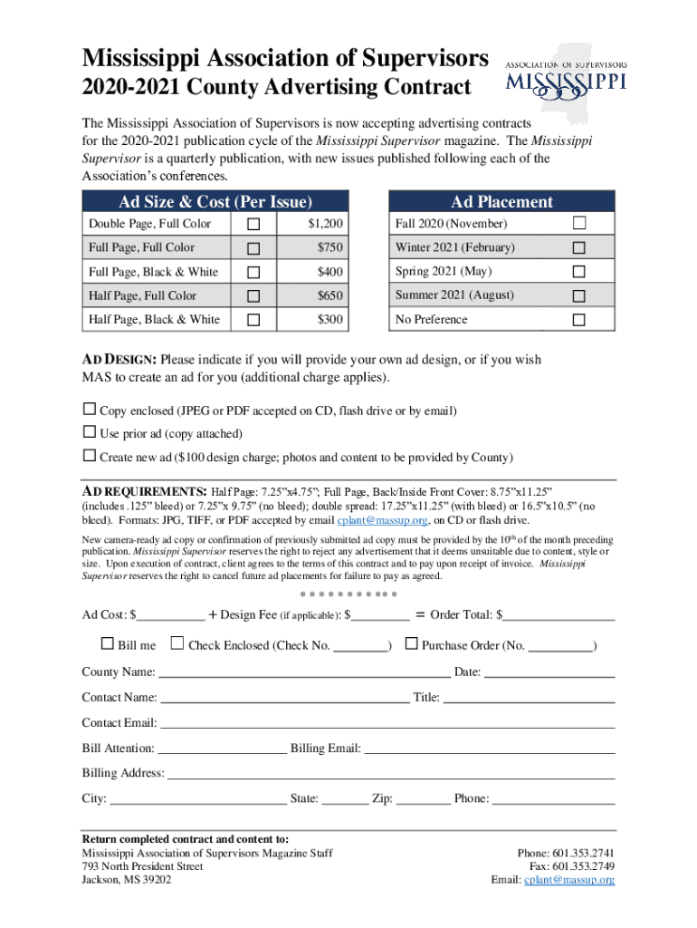 Mississippi Association of Supervisors 20202021 County Advertising Contract The Mississippi Association of Supervisors is now accepting advertising contracts for the 20202021 publication cycle of