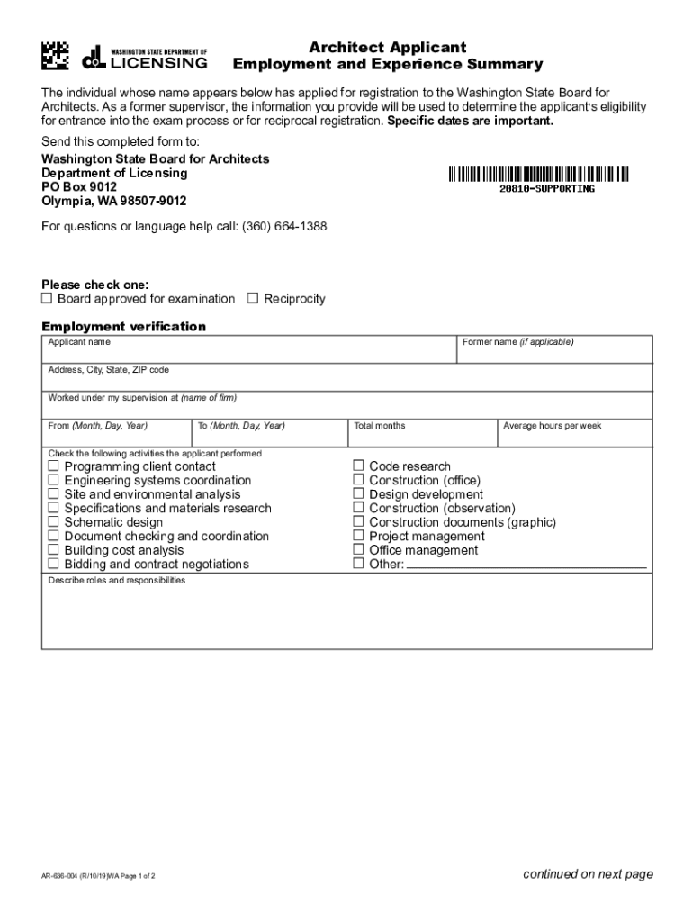 Architect Applicant Employment and Experience Summary The individual whose name appears below has applied for registration to the Washington State Board for Architects. As a former supervisor, the