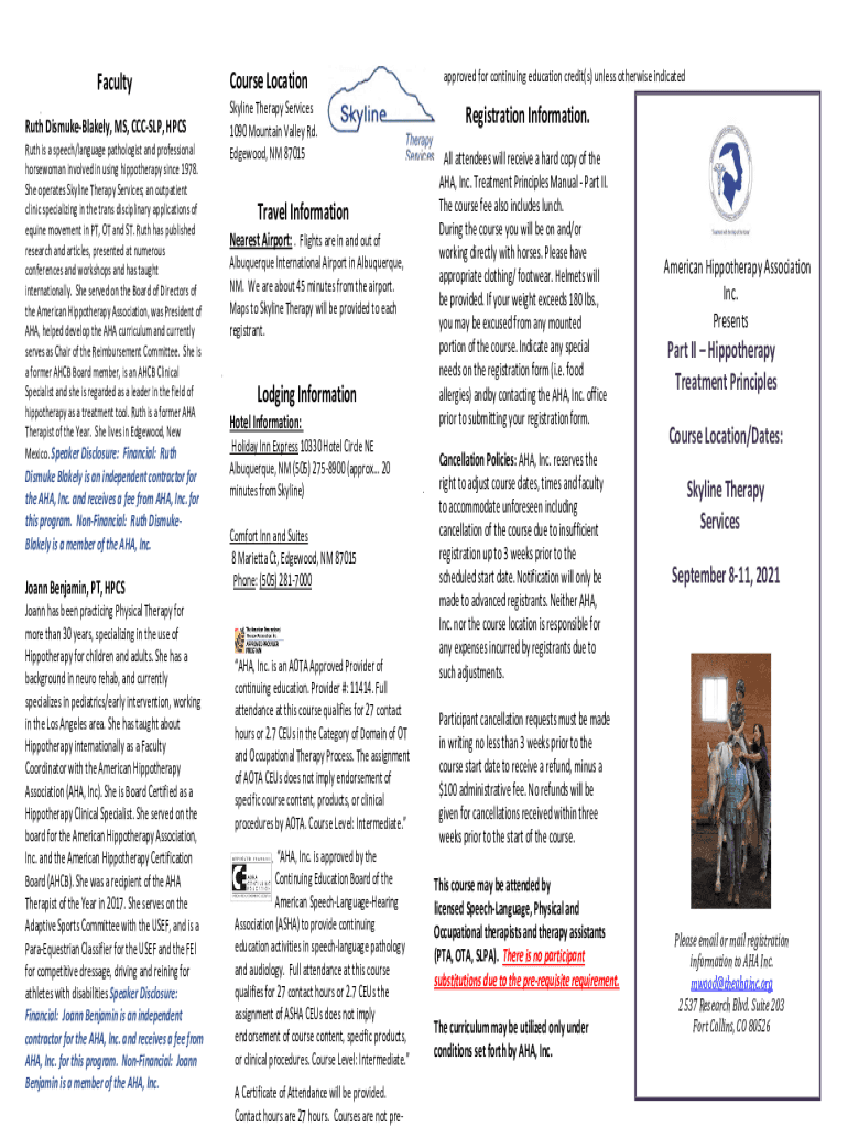 Faculty Ruth DismukeBlakely, MS, CCC SLP, PCs Ruth is a speech/language pathologist and professional horsewoman involved in using hippo therapy since 1978. She operates Skyline Therapy Services; an
