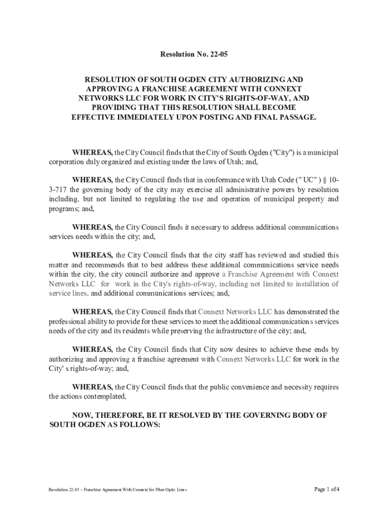 Resolution No. 2205 RESOLUTION OF SOUTH OGDEN CITY AUTHORIZING AND APPROVING A FRANCHISE AGREEMENT WITH CONTEXT NETWORKS LLC FOR WORK IN CITY\'S RIGHTSOFWAY, AND PROVIDING THAT THIS RESOLUTION SHALL
