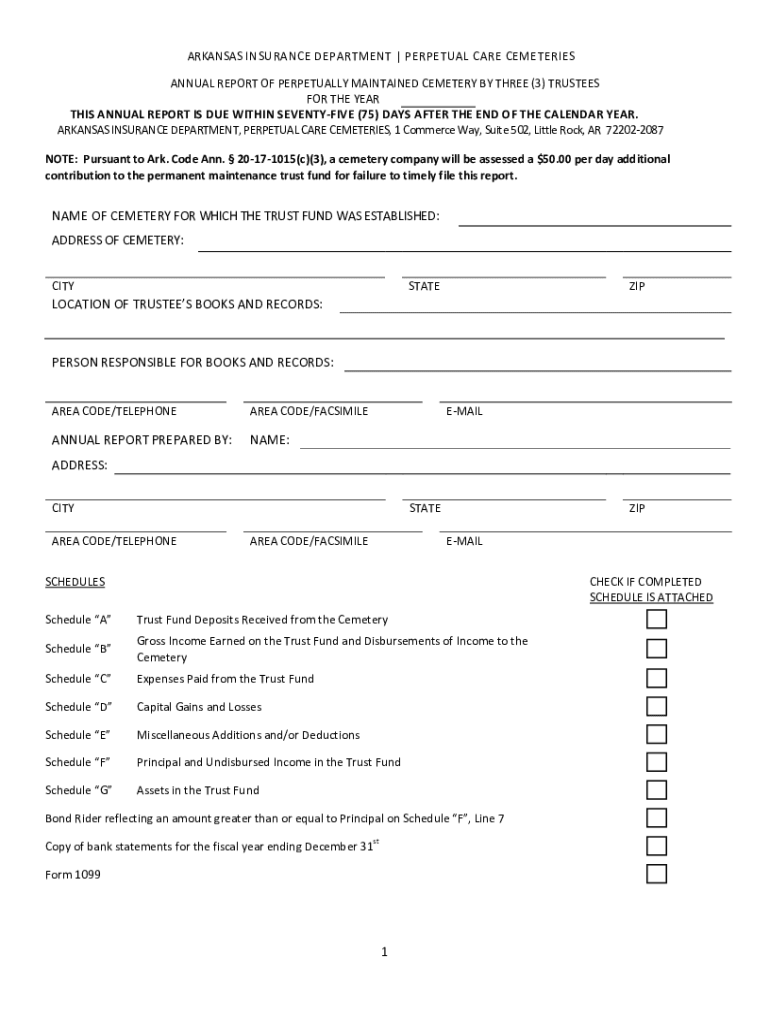 ARKANSAS INSURANCE DEPARTMENT | PERPETUAL CARE CEMETERIES ANNUAL REPORT OF PERPETUALLY MAINTAINED CEMETERY BY THREE (3) TRUSTEES FOR THE YEAR THIS ANNUAL REPORT IS DUE WITHIN SEVENTYFIVE (75) DAYS