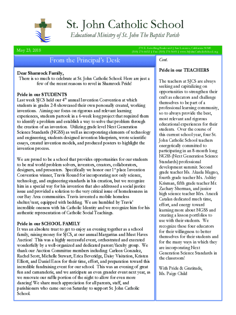 St. John Catholic School Educational Ministry of St. John the Baptist Parish 270 E. Le welling Boulevard | San Lorenzo, California 94580 (510) 2766632 | Fax: (510) 2765645 | www.StJohnCatholicSchool.orgMay