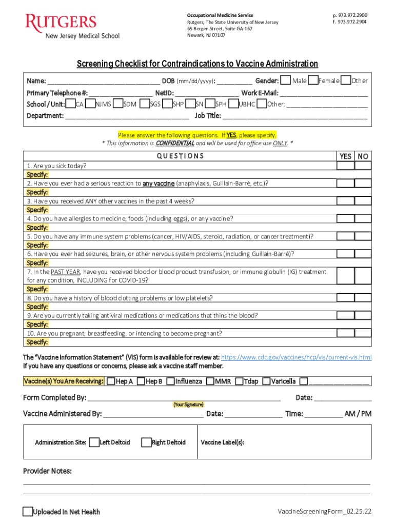 P. 973.972.2900 f. 973.972.2904Occupational Medicine Service Rutgers, The State University of New Jersey 65 Bergen Street, Suite GA167 Newark, NJ 07107Screening Checklist for Contraindications to