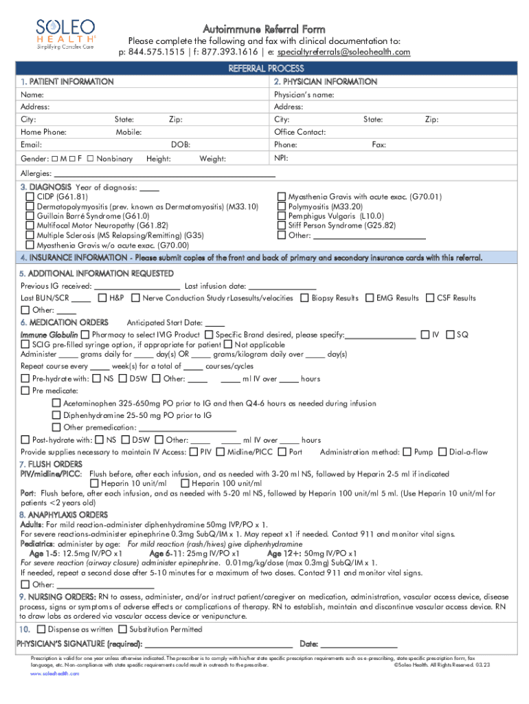 Autoimmune Referral Formulas complete the following and fax with clinical documentation to: p: 844.575.1515 | f: 877.393.1616 | e: specialtyreferrals@soleohealth.com REFERRAL PROCESS 1. PATIENT INFORMATION2.