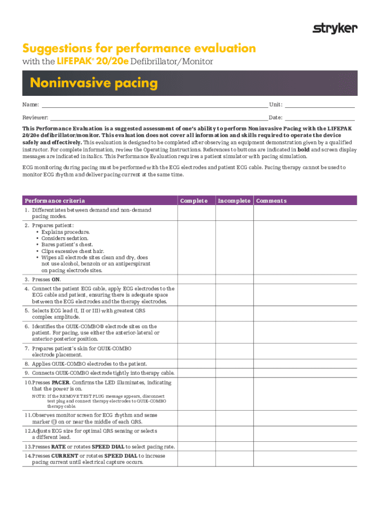 Suggestions for performance evaluation with the LIFE PAK 20/20e Defibrillator/Monitor Noninvasive pacing Name: ___ Unit: ___ Reviewer:___Date: ___ This Performance Evaluation is a suggested assessment