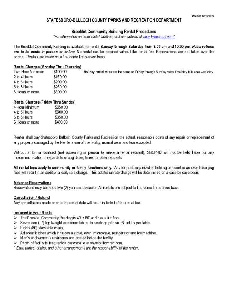 Revised 12/17/2020STATESBOROBULLOCH COUNTY PARKS AND RECREATION DEPARTMENT Brooklet Community Building Rental Procedures×For information on other rental facilities, visit our website at www.bullochrec.com×The