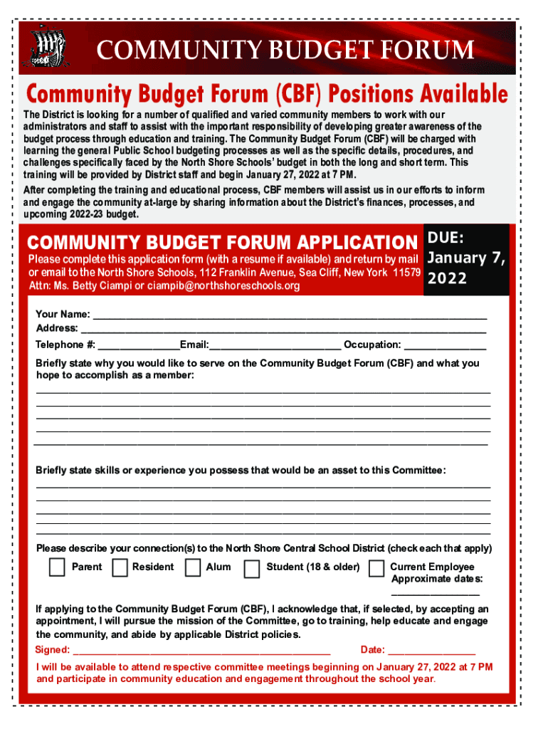 North Shore Schools COMMUNITY FORUM B o an r d o f E d u budget ationCommunity Budget Forum (CBF) Positions Available District is looking for a number of qualified and varied community members to
