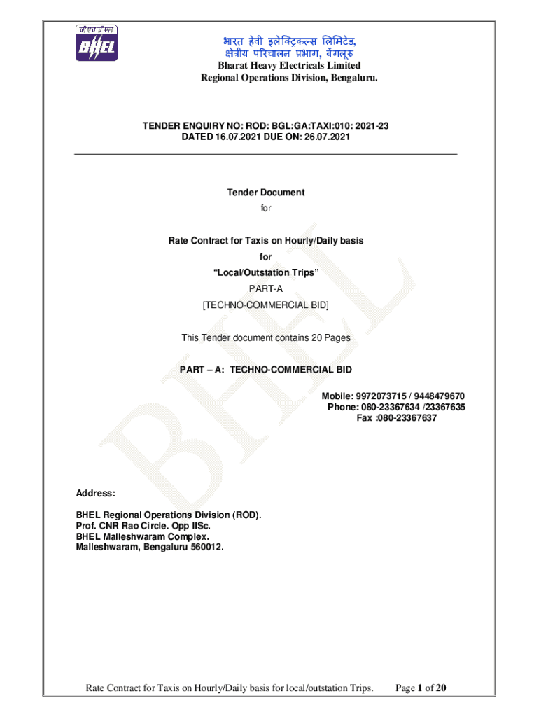 , Bharat Heavy Electrical Limited Regional Operations Division, Bengaluru. TENDER Inquiry NO: ROD: BGL:GA:TAXI:010: 202123 DATED 16.07.2021 DUE ON: 26.07.2021Tender Document for Rate Contract for