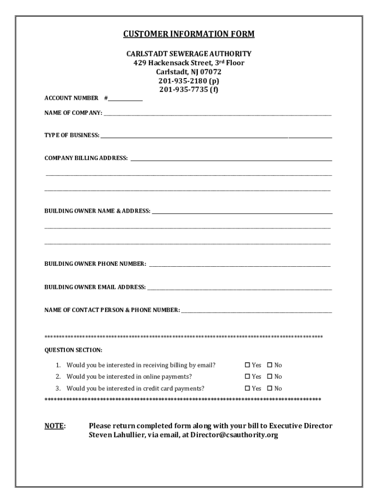 CUSTOMER INFORMATION FORM CARLSBAD SEWERAGE AUTHORITY 429 Hackensack Street, 3rd Floor Carlsbad, NJ 07072 2019352180 (p) 2019357735 (f)ACCOUNT NUMBER #___NAME OF COMPANY: ___ TYPE OF BUSINESS: ___