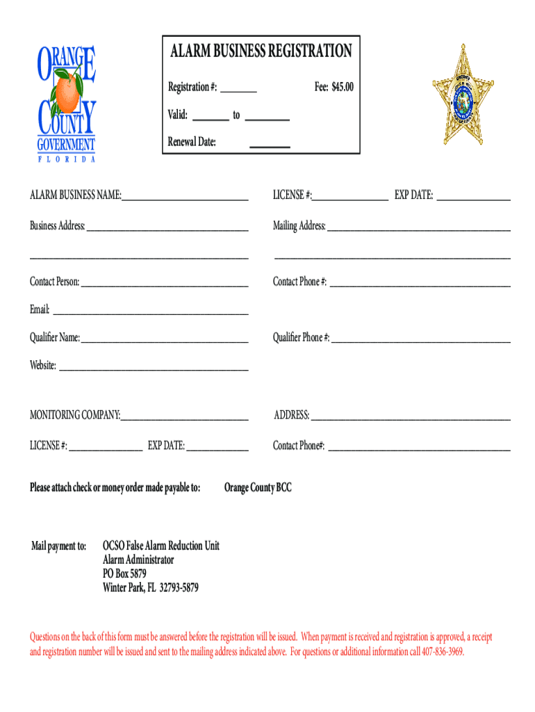 ALARM BUSINESS REGISTRATION #: ___Fee: $45.00Valid: ___ to ___ Renewal Date:___ALARM BUSINESS NAME:___LICENSE #:___EXP DATE: ___Business Address: ___Mailing Address: _________Contact Person: ___Contact
