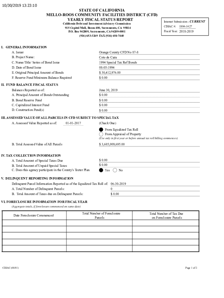 10/30/2019 13:23:10STATE OF CALIFORNIA MELLOWS COMMUNITY FACILITIES DISTRICT (CFD) YEARLY FISCAL STATUS REPORT California Debt and Investment Advisory Commission 915 Capitol Mall, Room 400, Sacramento,