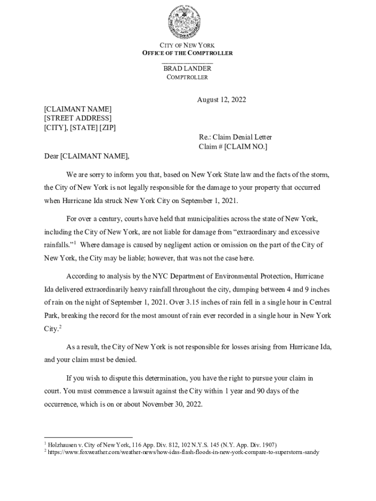 CITY OF NEW YORK OFFICE OF THE COMPTROLLER ___BRAD LANDER COMPTROLLER[CLAIMANT NAME] [STREET ADDRESS] [CITY], [STATE] [ZIP] Dear [CLAIMANT NAME], August 12, 2022Re.: Claim Denial Letter Claim # [CLAIM