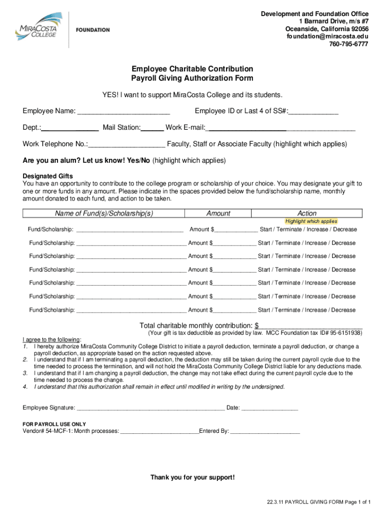 Development and Foundation Office 1 Barnard Drive, m/s #7 Oceanside, California 92056 foundation@miracosta.edu 7607956777Employee Charitable Contribution Payroll Giving Authorization Form YES! I want