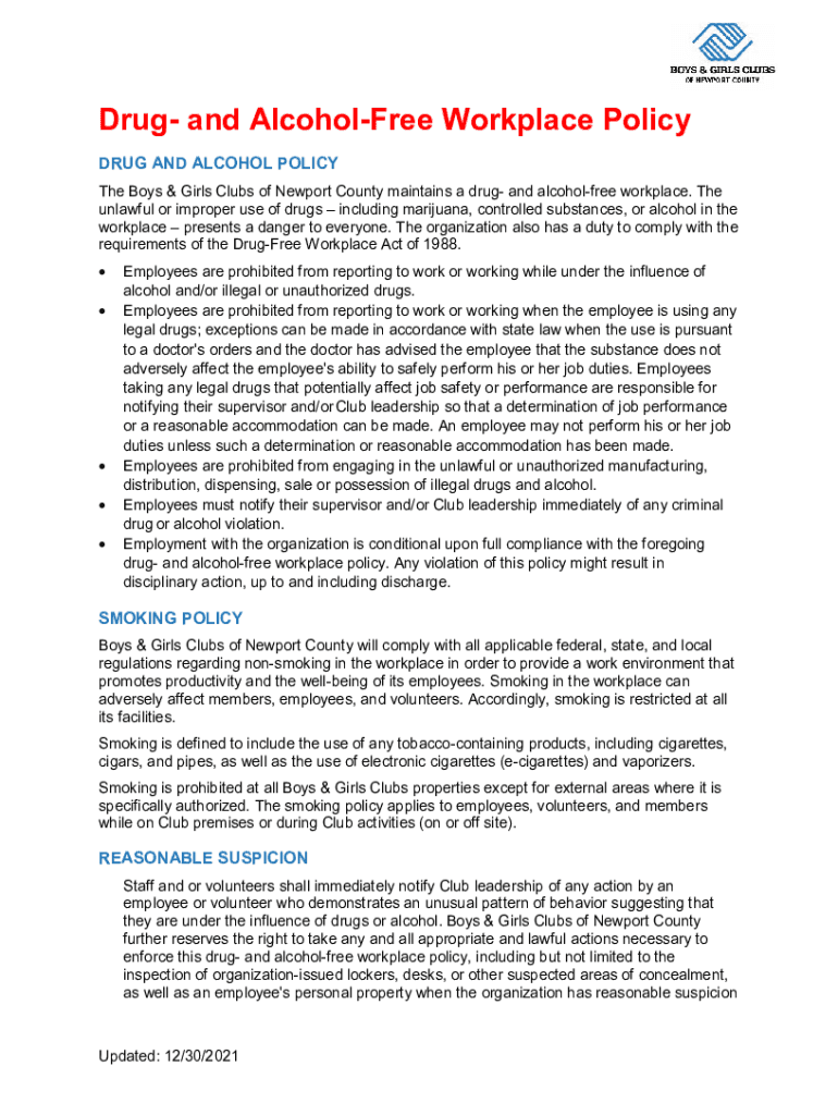 Drug and Alcoholize Workplace Policy DRUG AND ALCOHOL POLICY The Boys & Girls Clubs of Newport County maintains a drug and alcohol free workplace. The unlawful or improper use of drugs including marijuana,