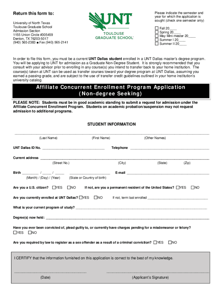 Please indicate the semester and year for which the application is sought (check one semester only)Return this form to: University of North Texas Toulouse Graduate School Admission Section 1155 Union