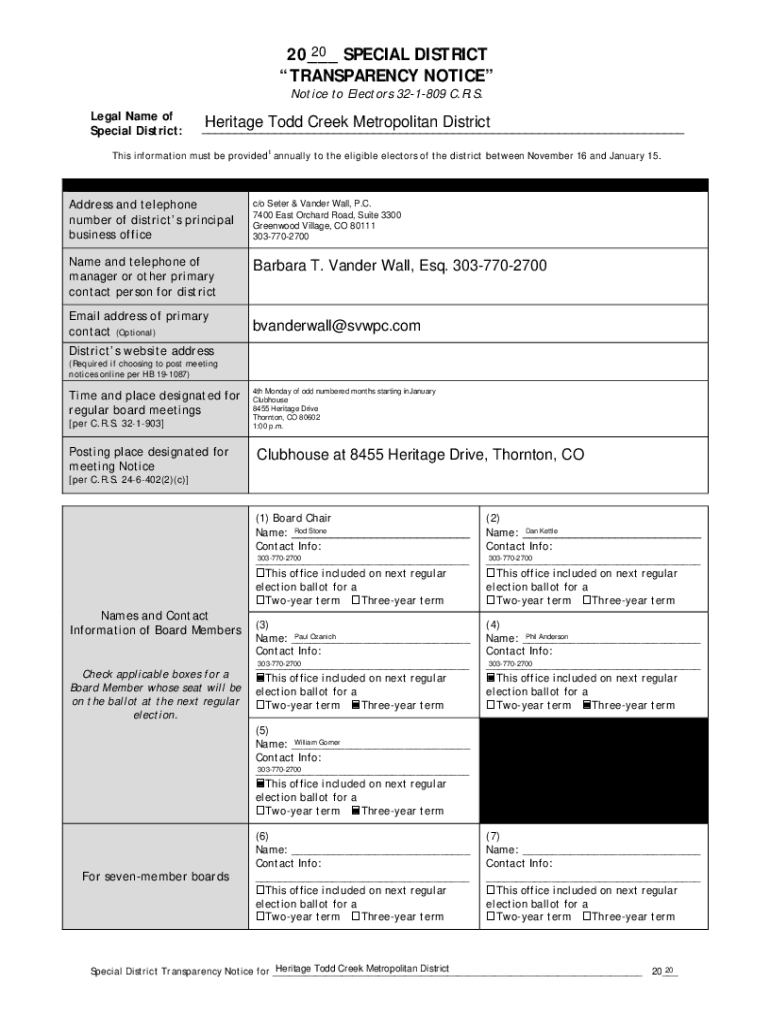 20 SPECIAL DISTRICT 20___ TRANSPARENCY NOTICE to Electors 321809 C.R.S. Legal Name of Special District:Heritage Todd Creek Metropolitan District ___This information must be provided1 annually to the